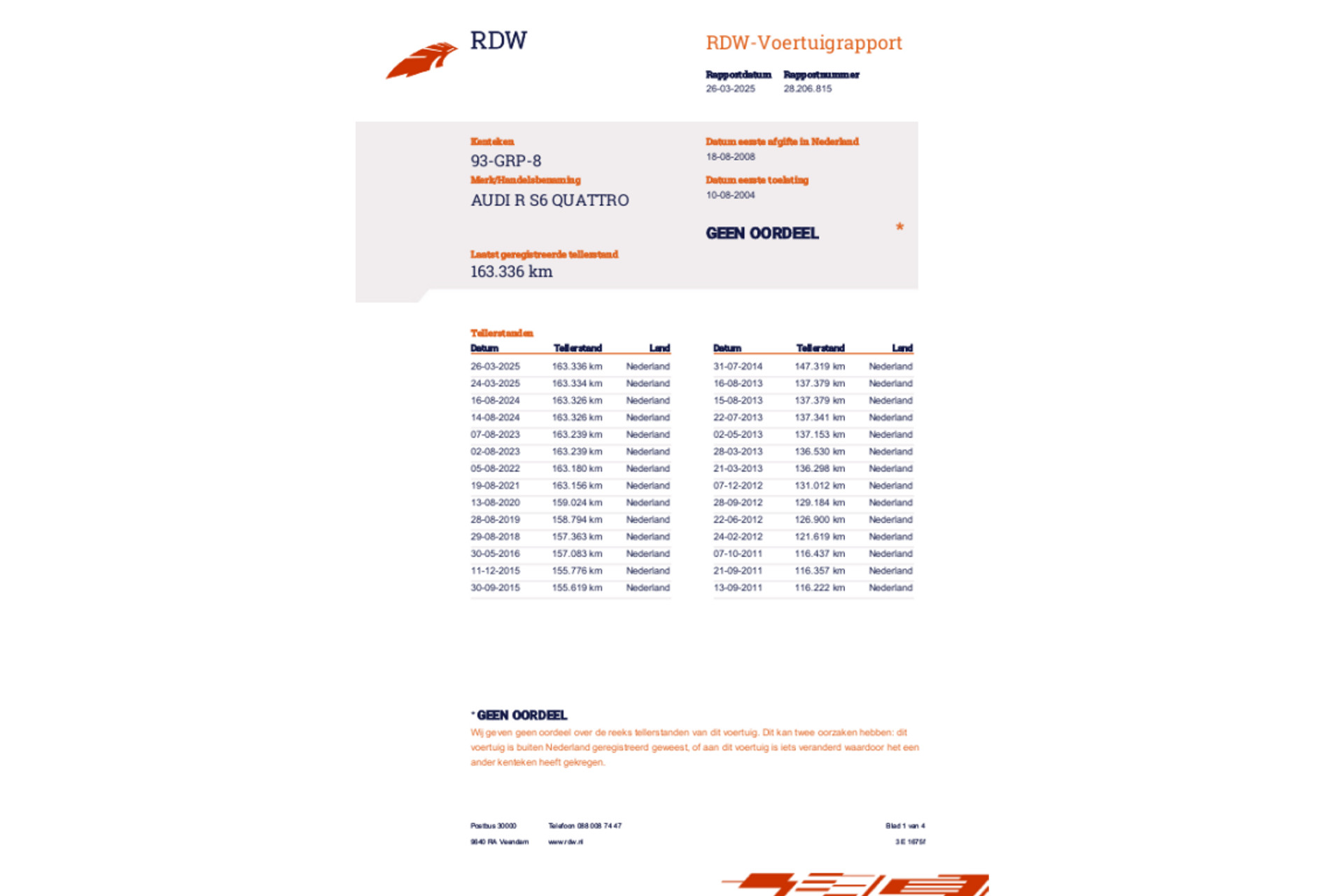 Recent onderhoud is uitgevoerd op de onderstaande data en kilometerstand: